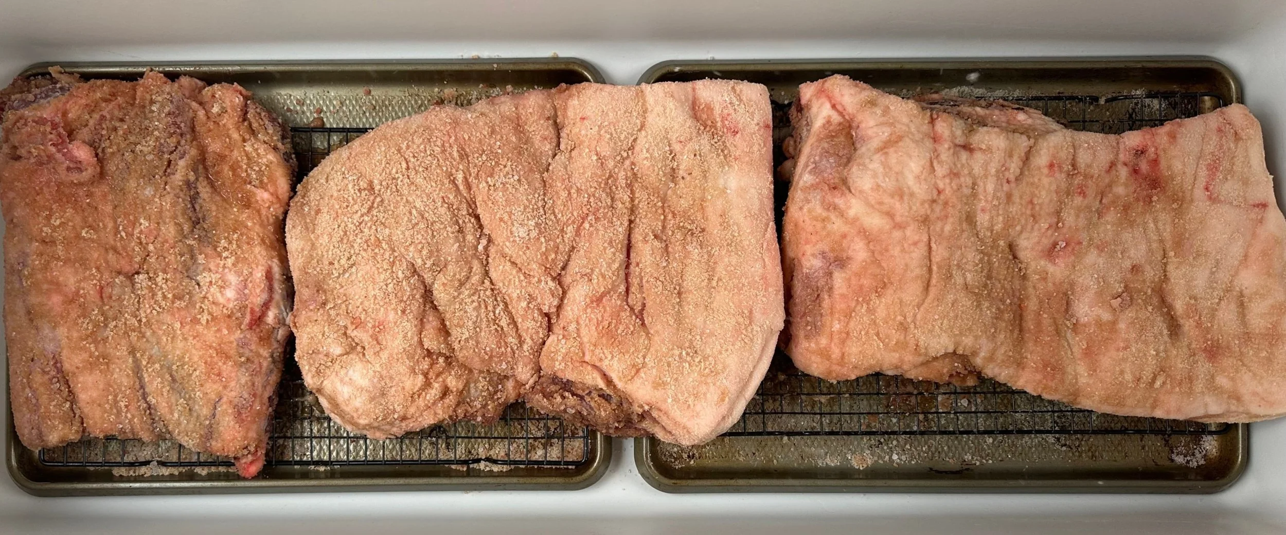 Pat it dry and place it on a rack in the refrigerator uncovered for 12-24 hours. This allows a pellicle (a tacky surface) to form, which helps with smoke absorption if you choose to smoke your bacon.